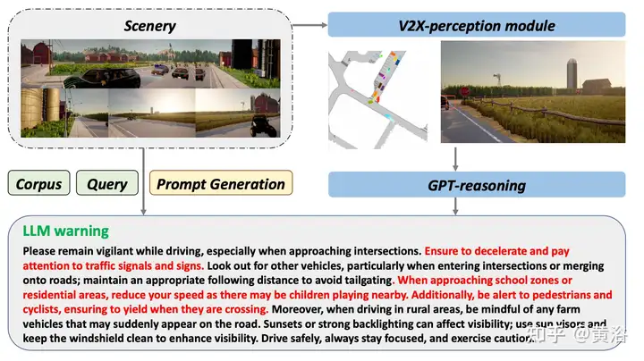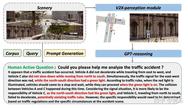 对于感知模块,该任务涉及利用来自多个设备和视角的输入生成3D目标检测框、BEV感知和轨迹预测。在自然语言推理任务方面,重点是用query模块查询的感知任务输入和输出信息。这还包括构建一个可学习和更新的LLM提示语料库,通过驾驶员的主动询问和模型的被动提示来实现主动提示,为驾驶员提供被动提示,如交通安全事件的预告和警告。此外,它还包括回应驾驶员的积极询问,处理交通部门发起的任务,如道路交通安全风险评估和确定交通事故责任。
