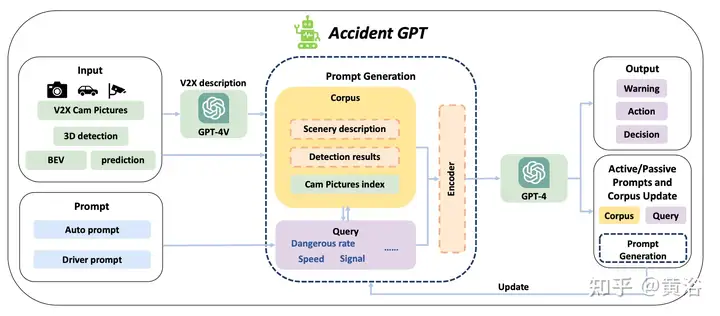 第二个核心组件是GPT推理模块,作为自然语言的推理交互模块。这包括标准的GPT-4V模块、语料库融合下多级优先级的采样提示模块、主动-被动任务提示模块以及用于事故相关任务的多输出模块。这种配置旨在促进无缝的人机协作,利用机器语言感知和人类思维驱动的知识来提高交通安全。