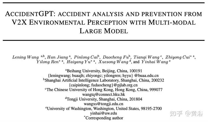 “AccidentGPT: Accident Analysis and Prevention From V2X Environmental Perception with Multi-modal Large Model“,来自北航、上海AI实验室、香港中文大学、同济大学和华盛顿大学。