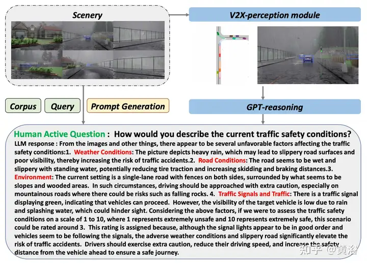 对于人类驾驶的车辆,如图所示,驾驶员主动询问交通状况。AccidentGPT模型利用V2X感知模块来解释图像,将其与GPT推理网络相结合,并为驾驶员提供有关车辆、道路和特定地标的判断和预测。这种互动的结果是向驾驶员提供警告和建议。