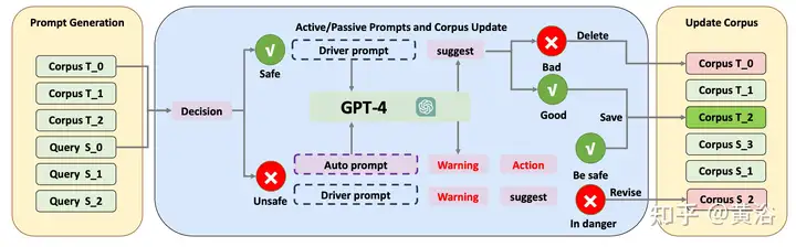 人机对话和互动,提供主动远程安全警告和盲点警报,改进安全驾驶建议和行为指南。这个旨在为驾驶员实施两套不同的提示规则,调整提示频率以确保安全余地。具体来说,在主动/被动提示和语料库更新模块中,可以利用LLM在提示模块的帮助下执行主动和被动提示任务。LLM评估正在进行的行为是否与驾驶员的预期安全风险提示范围一致,从而实现主动提示。提示的信息随后被用作后续提示的先验知识,积累了宝贵的安全余地经验,丰富了语料库模块。在系统识别出重大安全风险的情况下,无论驾驶员的提示要求如何,都需要发出风险提示,可能涉及自适应驾驶策略。对于语料库更新,作者引入了一种迭代更新方法,该方法不断从过去的事故案例和决策中学习,逐步增强模块的稳健性和推理准确性,将推理能力提升到更高的维度,如图所示。