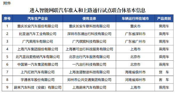 日前,工业和信息化部等四部门公布了一份名单,包含长安、比亚迪、广汽、上汽、北汽、一汽、宇通、蔚来等在内的9个汽车生产企业和使用主体组成的试点联合体,将在北京、上海、广州等7个城市展开智能网联汽车准入和上路通行试点。