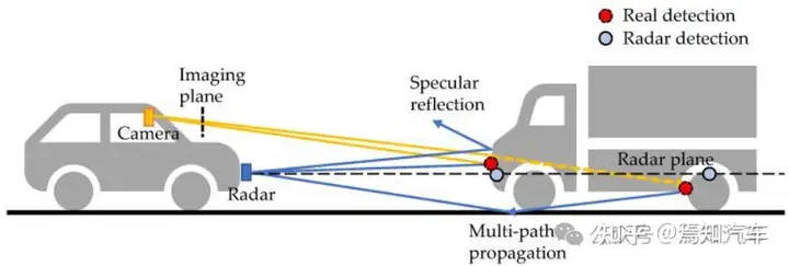 是深度估计的子问题,其目的是使用距离传感器测量的稀疏深度来恢复图像的密集深度图。如下图所示,由于多路径传播,雷达可以看到非视距高反射物体,例如轮圈和被遮挡的车辆,这种现象称为透视效应。在3D坐标中很有用,但会带来将雷达检测与图像视图中的视觉对象关联起来的困难。