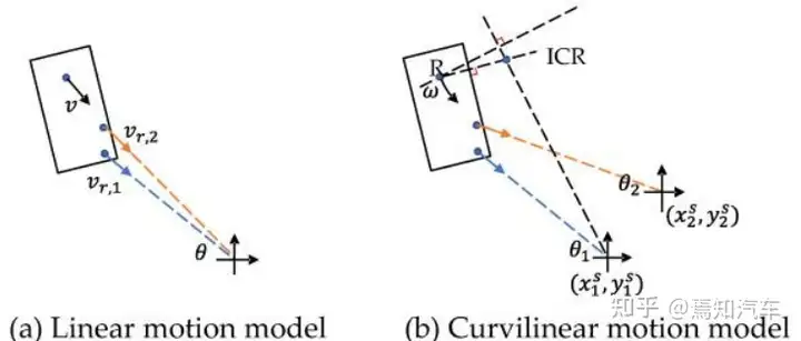 图4 雷达运动模型。(a)线性运动模型需要对物体进行多次检测。(b)曲线运动模型需要两个雷达观测相同的物体或确定车辆边界和后轴。