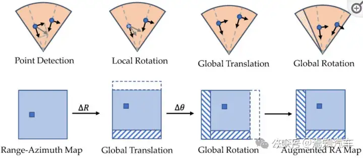 如上图所示,雷达测量的多普勒速度是标量,因此雷达探测的局部旋转会导致多普勒速度与真实速度之间的偏差,而全局平移和旋转不会出现这种错位。在增强雷达RA图时,需要对背景区域进行插值并补偿探测强度。