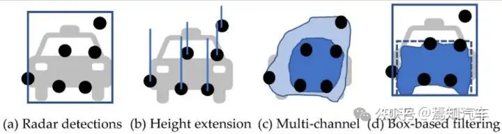 图3 (a)雷达探测扩展技术。(b) 扩大雷达探测高度。(c) 构建概率图,其中深/浅蓝色表示具有高/低置信度阈值的通道。(d) 根据边界框应用严格的过滤,其中仅保留与正面相对应的检测。