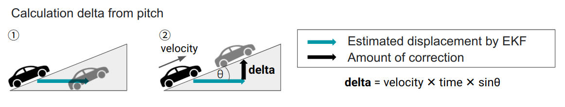 - 从俯仰角计算垂直校正量,可以减轻坡度上的定位不稳定性。例如,上坡时,由于EKF只考虑3DoF(x,y,偏航),它的行为就像被埋在地下一样(见“从俯仰角计算增量”图的左侧)。因此,EKF根据公式校正z坐标(见“从俯仰角计算增量”图的右侧)。