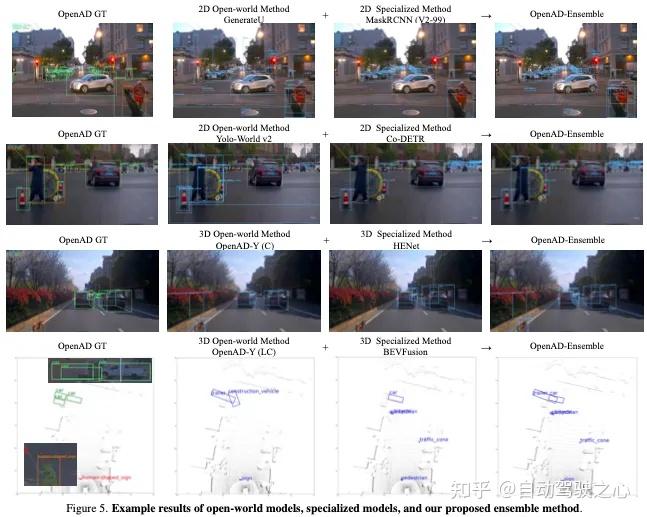 - 提出了一种结合二维开放世界模型的三维开放世界感知基线方法。此外,我们分析了开放世界和专业模式的优缺点,并进一步介绍了一种融合方法来利用这两种优势。