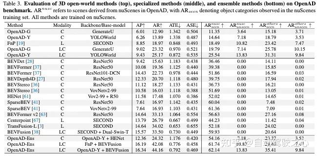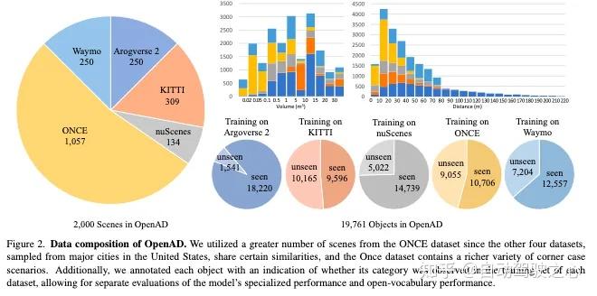 3D基准。3D开放世界基准测试可分为两类:室内和室外场景。对于室内场景,SUN-RGBD和ScanNet是两个经常用于开放世界评估的真实世界数据集,分别包含约700和21个类别。对于户外或自动驾驶场景,AnoVox是一个合成数据集,包含35个类别的实例掩码,用于开放世界评估。然而,由于模拟资产有限,合成数据的质量和实例多样性不如真实世界的数据。除了AnoVox之外,现有的用于自动驾驶的真实数据3D目标检测数据集只包含少数目标类别,很难用于评估开放世界模型。为了解决这个问题,我们提出了OpenAD,它由真实世界的数据构建而成,包含206个出现在自动驾驶场景中的不同corner-case类别。