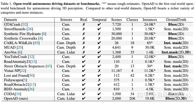 在自动驾驶领域,如表1所示,也提出了许多数据集。其中,CODA是一个用于自动驾驶中二维物体检测的道路拐角案例数据集,包含1500个道路驾驶场景,其中包含34个类别的边界框注释。然而,一些数据集只提供语义分割注释,没有特定的实例,或者将目标注释为异常但缺乏语义标签。此外,从真实世界的驾驶数据中收集的数据集规模较小,而来自CARLA等模拟平台的合成数据缺乏真实性,因此难以进行有效的评估。相比之下,我们的OpenAD提供了来自真实世界数据的大规模2D和3D边界框注释,用于更全面的开放世界目标检测评估。