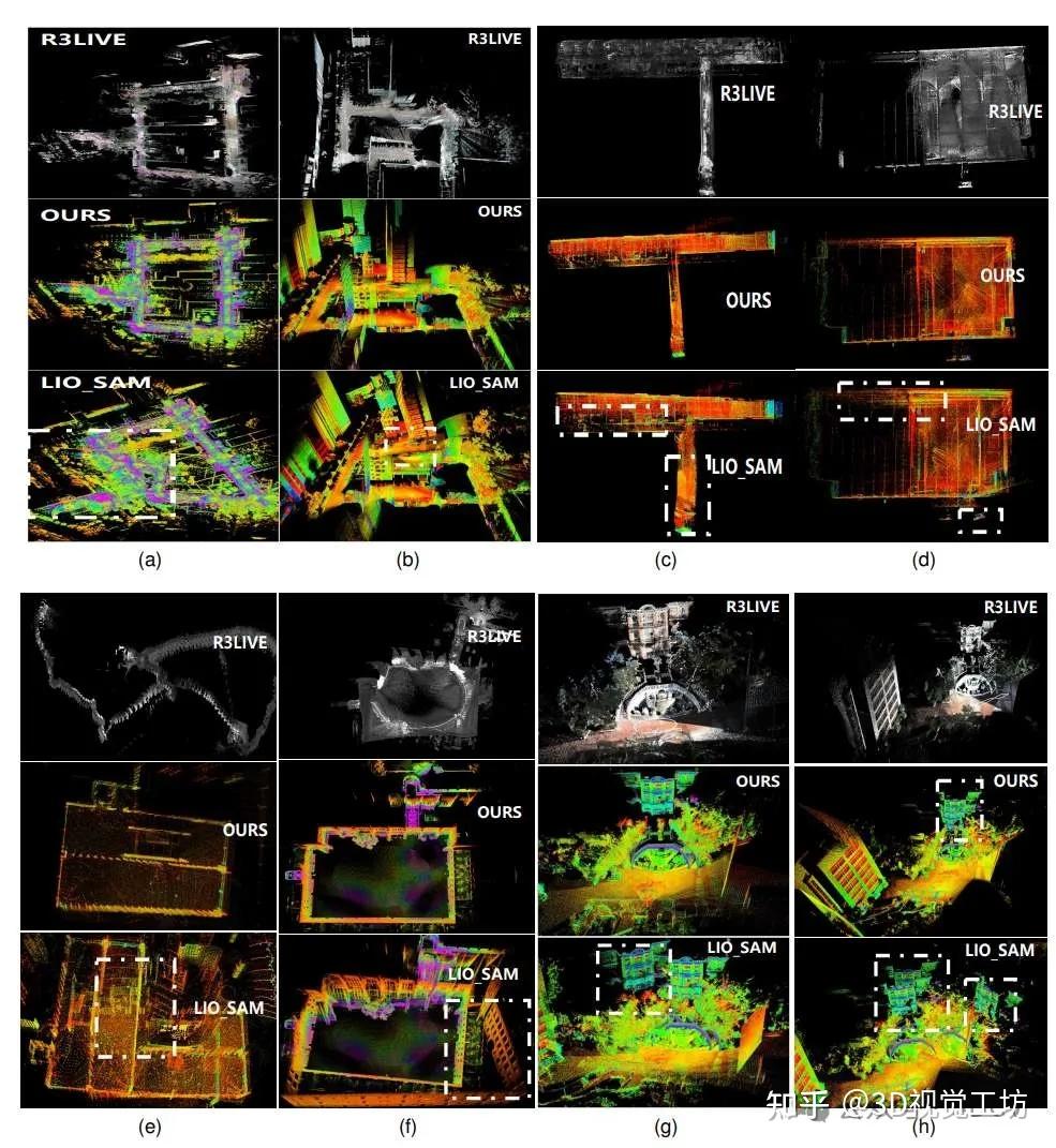 建图结果。(a)·(h)分别表示 Campus、XHL、Basement、UzH、Quad、Construction和degenerate_00、degenerate_01。虚线框表示地图的可见重彩。