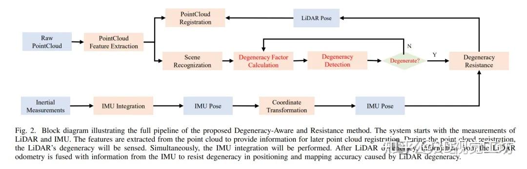 激光雷达广泛应用于同步定位和地图绘制(SLAM)以及自动驾驶。激光雷达里程计在多传感器融合中具有重要意义。然而,在一些非结构化环境中,点云配准由于其稀疏的几何特征而无法约束激光雷达的姿态,导致多传感器融合精度退化。为了解决这个问题,我们提出了一种新的实时方法来检测和补偿激光雷达的退化。本文首先引入了意义明确的简并因子,它可以度量激光雷达的简并度。然后,基于密度的带噪声应用空间聚类(DBSCAN)聚类方法自适应地感知退化,具有更好的环境泛化能力。最后,利用简并感知结果融合激光雷达和惯性测量单元,从而有效抵抗简并效应。在我们的数据集上的实验表明了该方法的高精度和鲁棒性,并验证了我们的算法对不同环境和激光雷达扫描模态的适应性。