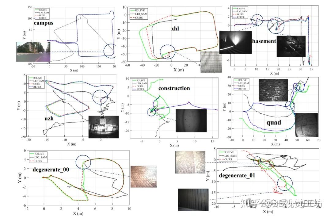 轨迹结果显示,轨迹上方的圆圈表示LIO-SAM或OUR在该位置漂移,并显示了退化环境。