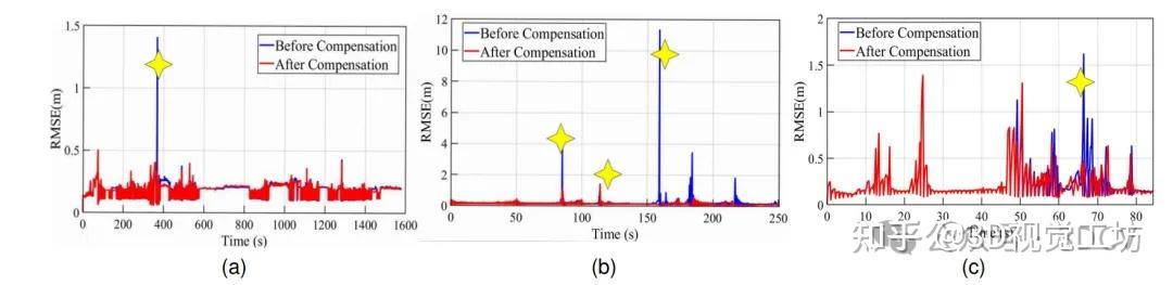 退化补偿前后点云配准的均方根误差(RMSE)。图(a)、(b)和(c)分别表示校园、xhl和degenerate 00的退化因子。图中的黄色四角星表示在该时间段内发生了激光雷达退化。