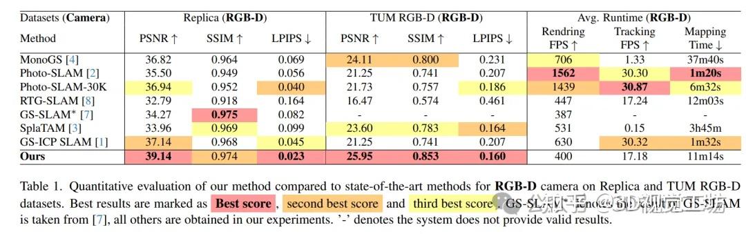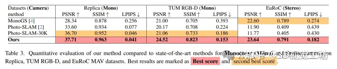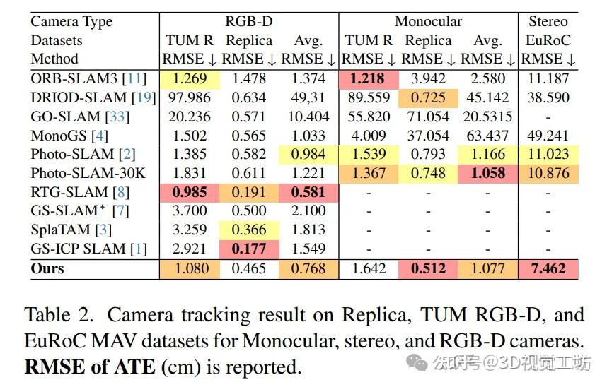 只有少数方法支持单目、立体和RGB-D相机。MonGS通过针对3D高斯分布的直接优化来制定3DGS的相机跟踪,允许所有三种类型的相机进行定位和逼真的映射。然而,其立体相机和单目相机之间的渲染质量差距显著。Photo-SLAM引入了一个解耦框架来优化3D高斯分布,实现了单目、立体和RGB-D相机的实时定位和逼真映射。虽然它在实时性能和单目与RGB-D相机之间的渲染质量差距方面表现出色,但其主要限制在于整体渲染质量。我们的工作旨在显著提高单目、立体和RGB-D相机的渲染精度。推荐课程:实时400FPS!高精NeRF/Gaussian SLAM定位与建图。