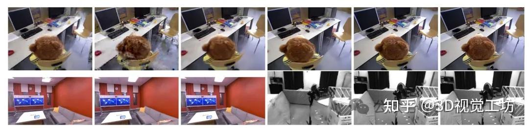 我们的方法Scaffold-SLAM以高画质实现逼真的映射,质量优于最先进的方法(GS-ICP SLAM),Photo-SLAM,SplaTAM,MonoGS),包括单目、立体和RGB-D相机。顶部:结果来自TUM RGB-D数据集的RGB-D相机。底部:左三幅图像来自Replica数据集的单目相机,右三幅来自EuROCMAV数据集的立体相机。质量上的明显差异由插图突出显示。