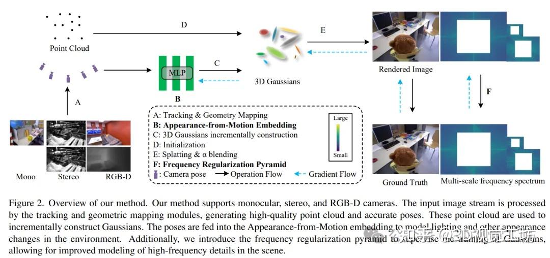 我们的方法支持单目、立体和RGB-D相机。输入图像流经由跟踪和几何映射模块处理,生成高质量的点云和精确位姿。这些点云被用于逐步构建高斯模型。位姿被输入到基于运动的外观嵌入模型中,以模拟环境中的光照和其他外观变化。此外,我们引入了频率正则化金字塔来监督高斯模型的训练,从而能够改进场景中高频细节的建模。