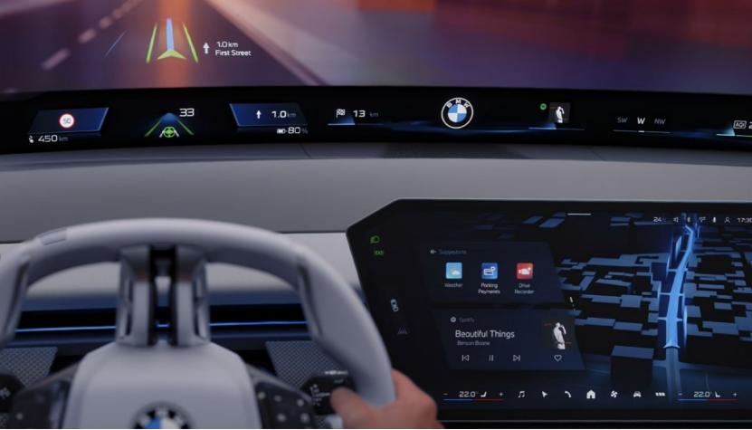 宝马在CES 2025上全球首发的全新车机系统——宝马全景 iDrive,其核心亮点之一的视平线全景显示,其显示区域覆盖挡风玻璃底部约80%的宽度,运用超近距投影技术,于挡风玻璃下部的黑色涂层上投射信息,取代传统仪表盘,为驾驶员提供了比传统仪表盘多出近3倍的信息展示空间。在驾驶员侧呈现行车关键数据,如车速、转速、续航里程等,中央与乘客侧区域则可依个人需求定制显示内容,如实时导航路线、多媒体播放列表、车辆状态监测信息等。