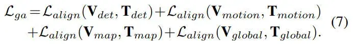 为了充分利用不同特征之间的多级关联,我们利用对比学习设计了分组对齐策略。考虑了四种类型的 3D 视觉语言 (VL) 对齐组,包括检测相关 VL 组、运动相关 VL 组、地图相关 VL 组和全局 VL 组。例如,在一批K个训练样本中,对齐函数