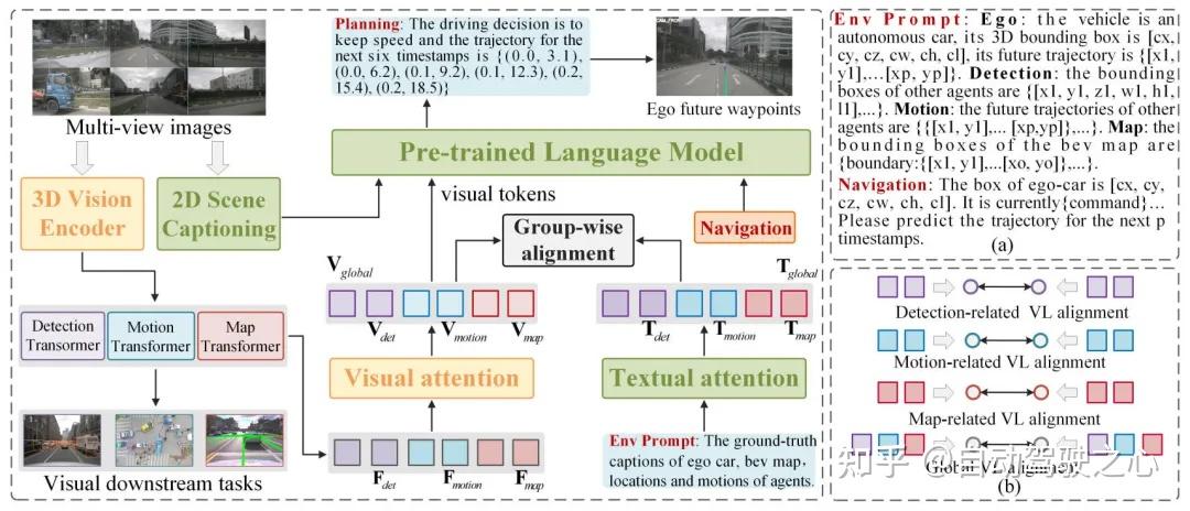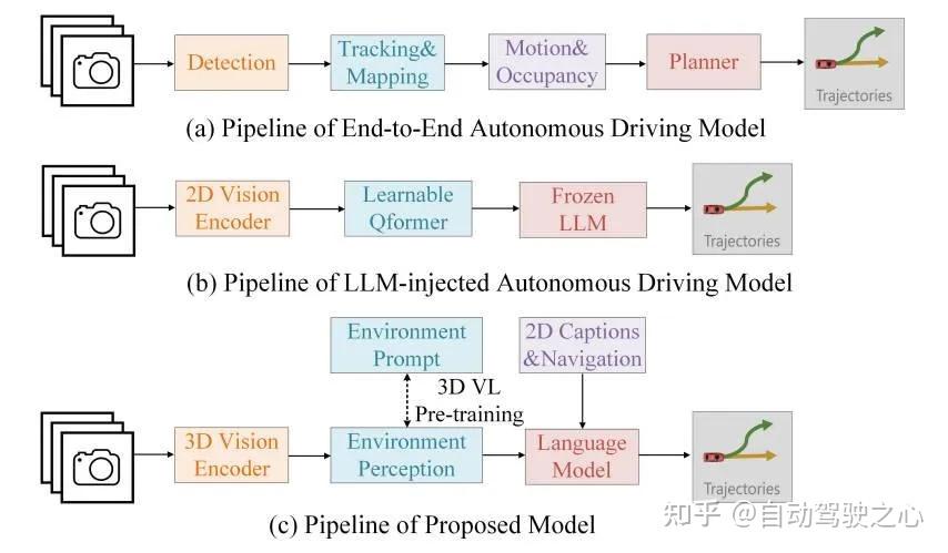 通过上图可以看出,大多数方案利用传感器信息将多个视觉任务(例如:3D 物体检测和运动预测)集成到一个网络中,以提高规划性能。然而,这些仅基于视觉的方法难以结合上下文线索进行安全决策,需要进一步的进行优化。随着大语言模型 (LLM) 的快速发展,出色的推理能力引起了人们的极大兴趣,并促进了自动驾驶领域的应用。如上图(b)所示,最近的几种方法引入了多模态大语言模型
