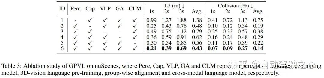 下表中的消融实验结果系统地调查了 GPVL 关键组件对 nuScenes 数据集的贡献。如果没有感知模块,GPVL 很难检测前景物体、预测运动和构建地图,从而导致更高的 L2 和碰撞分数。禁用 VLP 和 GA 组件会显著降低性能,凸显出模型在视觉和语言理解之间架起桥梁的强大能力。没有 GA 会导致明显的性能下降,表明其在细粒度特征关联中的重要性。排除 CLM 会增加 L2 和碰撞分数,强调其在生成合理规划决策中的作用。最后,如下表第六行所示,所有模块的集成产生了最佳性能,展示了组合系统的协同效应