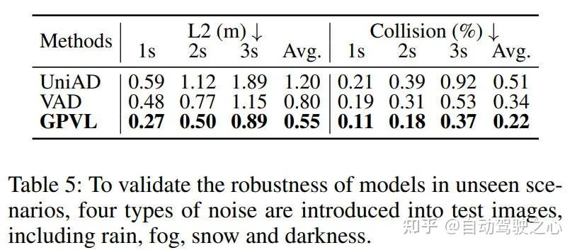 此外,在测试图像中引入了四种噪声(即雨,雾,雪和黑暗)以验证GPVL的稳健性,如表5所示,这些噪声条件对UniAD和VAD有显著的负面影响,而对GPVL的影响较小。因此,GPVL在各种现实场景中的出色表现证明了其能够提高自动驾驶系统的稳健性和安全性。