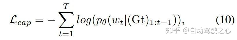与大多数视觉字幕任务类似,引入交叉熵损失以语言建模方式输出轨迹。在训练期间,每个样本都配备一个提示字幕真值作为参考,其中包括高级命令和自车的未来轨迹,损失函数