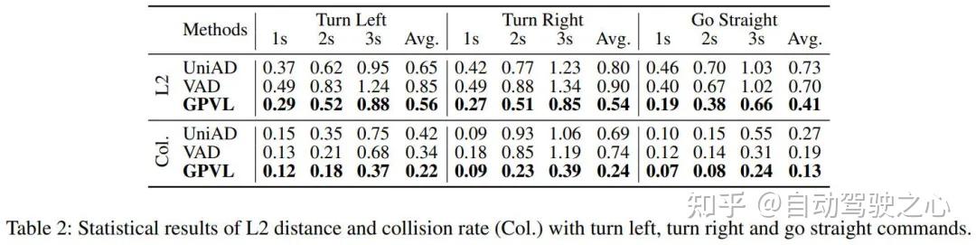 下表显示了在左转、右转和直行命令方面评估的 L2 和碰撞得分。很明显,GPVL 在所有指标上的表现都明显优于 UniAD 和 VAD。在 nuScenes 数据集中,87.7% 的训练样本和 88.2% 的验证样本由简单的直行场景组成。因此,UniAD 和 VAD 更容易在这些样本上过度拟合和学习捷径,导致在更复杂的转弯场景中表现不佳。相比之下,所提出的方法在所有场景中都获得了良好的结果,在各种驾驶情况下都表现出强大的泛化能力