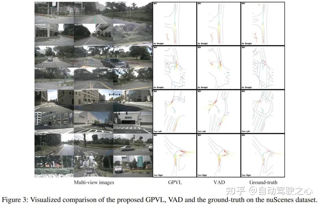 总体而言,得益于提出的 3D 视觉语言预训练模块和跨模态语言模型,设计的模型可以生成准确合理的轨迹。例如,在第一个场景中,当指示自车直行时,GPVL 生成的轨迹引导车辆安全地穿过城市道路。相比之下,VAD 的轨迹有与路边相撞的风险。在第三种情况下,GPVL 的结果与真值情况非常一致,使车辆能够在路口安全地左转。然而,VAD 的规划决策更具侵略性,可能会导致与迎面而来的车辆相撞。
