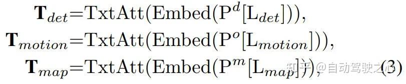 为了赋予模型语言感知能力,我们利用 BERT 结构提出了一个文本注意模块。该模块处理感知和规划标签,例如边界框、未来轨迹和地图元素,并使用预定义模板将其转换为特定于驾驶的语言提示。随后将与检测、运动和地图特征相关的描述输入到文本注意模块中,以生成相应的语言表示。现在,整个过程可以表述为如下的形式