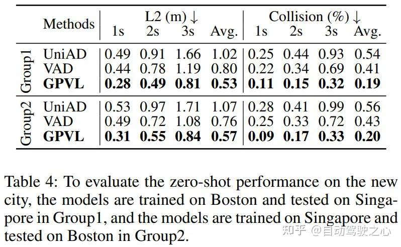 为了验证模型的泛化能力,我们在由两个不同的城市环境(即波士顿和新加坡)构建的数据集上对模型进行了训练和测试。具体来说,我们引入了两组实验:(1)在波士顿训练并在新加坡测试,(2)在新加坡训练并在波士顿测试。如下表所示,两组中GPVL的评估分数明显优于UniAD和VAD。