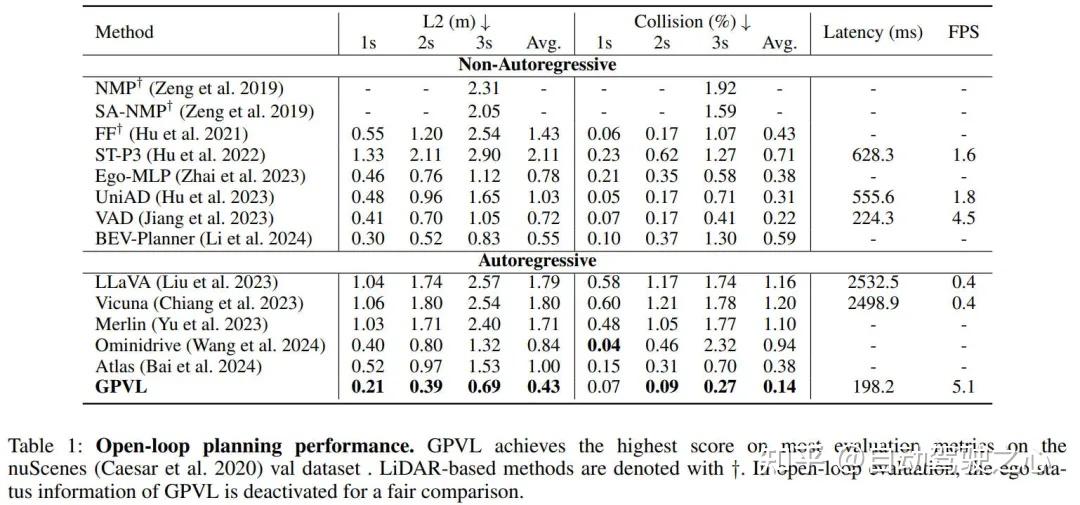 此外,GPVL 在大多数碰撞率指标中表现出最佳性能,凸显了其在避免碰撞方面的卓越安全性和稳健性。与引入辅助任务或使用 LLM 的方法相比,所提出的方法保持了相当的规划性能,实现了 188.7 毫秒的延迟和 5.3 fps 的推理速度,具有实际应用的潜力。根据BEV-Planner的报告,所提出的方案排除了自车状态信息以防止捷径学习。