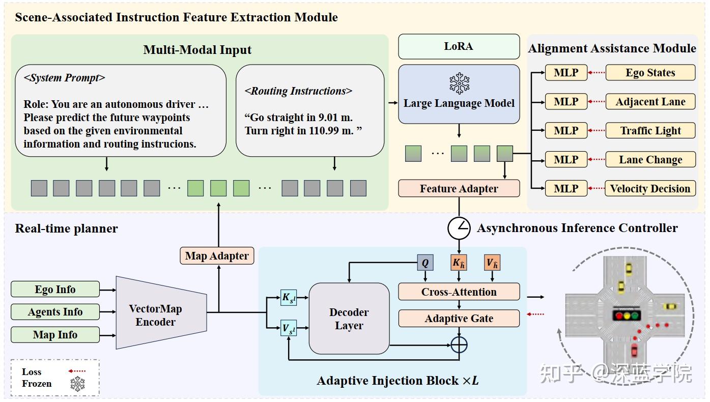 此外,一些工作如LMDrive和LanguageMPC聚焦于闭环评估,通过在大语言模型后连接低层控制器或回归器实现精确的车辆控制。但这些方法需要在每个规划步骤进行完整的语言解码或大语言模型推理,这给实时响应和实际部署带来挑战。