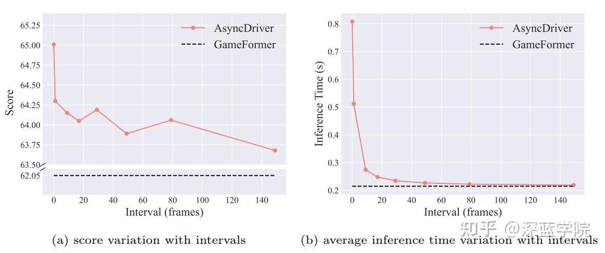 在异步推理方面,研究团队认为,特别是对于一般化的高层指令,在短时间间隔内的帧之间存在显著的相似性。因此,考虑到大语言模型在提取这些高层特征方面的作用,它不需要参与每一帧的推理过程,这可以显著提升推理速度。为探索这一点,实验设计区分了大语言模型和实时规划器的推理频率,在每个大语言模型推理间隔期间,使用先前的指令特征来引导实时规划器的预测过程。如图3所示,随着大语言模型规划间隔的增加,该方法的性能表现出显著的稳健性,这表明大语言模型能够提供长期的高层指令。实验观察到,即使在149帧的间隔下(意味着在一个场景中只进行一次推理),性能仍然超过GameFormer 1.0分以上,而推理时间接近实时水平。随着推理间隔的增加,所需的推理时间急剧下降,而准确性几乎保持稳定。因此,通过采用密集训练与异步推理相结合的策略,该方法在准确性和推理速度之间取得了最佳平衡。