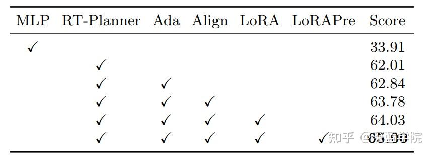 在组件消融方面,将简单的MLP作为大语言模型后的预测头用于规划显著降低了性能,这表明简单的轨迹回归无法有效对齐多模态信息,因此无法利用大语言模型对场景的推理能力。研究团队用实时规划器替代MLP,并逐步添加了四个结构:(i)自适应注入模块,(ii)对齐辅助模块,(iii)LoRA,以及(iv)预训练的LoRA。如表4所示,每个模块都提升了性能,其中对齐辅助模块和预训练的LoRA权重贡献最大,分别带来0.94和0.97的分数提升。