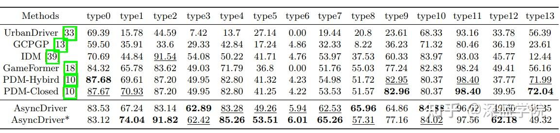 在Hard20评估方面,如表1所示,AsyncDriver相比现有规划器取得了最高性能,相比GameFormer提升了4.6%(约2.95分),甚至超过了当前最先进的基于规则的规划器。为了公平比较,考虑到轨迹细化和对齐在闭环评估中的重要影响,研究团队将PDM评分器适配到AsyncDriver(记为AsyncDriver*),这使得性能相比PDM-Hybrid和PDM-Closed分别提升了5.3%和5.1%(约3.43和3.30分),相比学习型规划器GameFormer提升了8.7%(约5.43分)。从另一个角度看,表2展示了Hard20数据集中每种场景类型的得分以及与现有规划器的比较,结果表明该方案在大多数场景类型中都取得了卓越的表现。