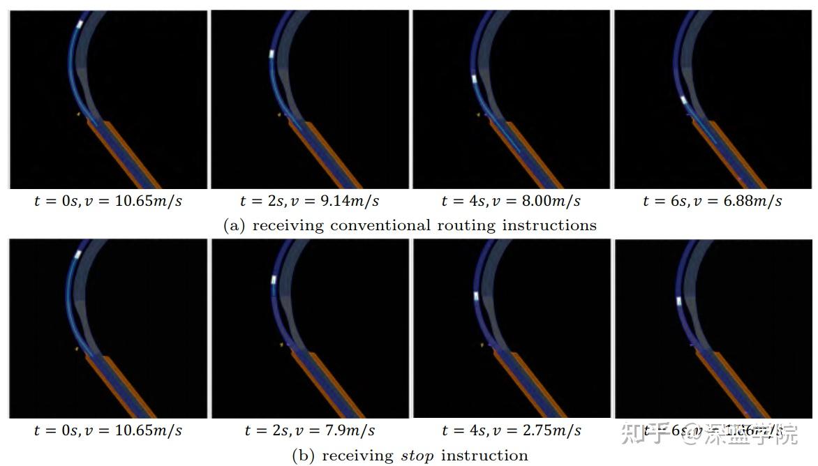 图4展示了该方法对不同路由指令的反应,展示了其在指令遵循方面的能力。图4a展示了场景采用常规路由指令时的预测结果。我们注意到自车略微减速,这反映了在弯道处降低速度的常识性判断。然而,考虑到道路畅通的情况,自车保持了相对较高的速度。相比之下,图4b描述了以”停止”作为路由指令的场景。值得注意的是,即使在没有外部障碍物的情况下,自车也迅速对命令做出刹车响应,在短短6秒内将速度从10.65m/s降低到1.06m/s。因此,很明显AsyncDriver可以作为语言交互接口,具备精确理解和遵循人类指令以规避异常情况的能力。