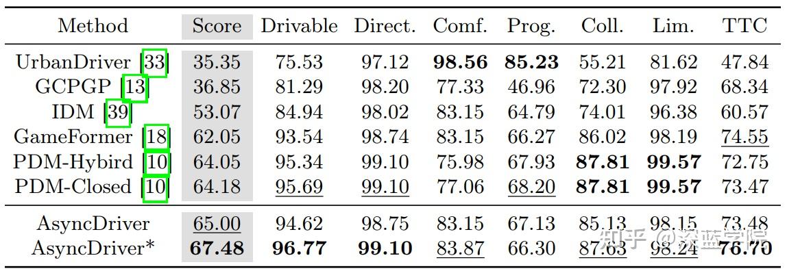 在实现细节方面,所有实验都在闭环反应式设置下进行。在这种设置中,场景中的智能体可以配备IDM规划器,使它们能够对自车的行为做出反应。仿真频率为10Hz,在每次迭代中,预测轨迹的时间范围为8秒。评估遵循nuPlan挑战赛提出的闭环指标,具体细节在补充材料中详细说明。在模型设置方面,AsyncDriver基于Llama2-13B构建,LoRA配置为R=8和α=32,使用AdamW优化器和带衰减的预热调度器,学习率设为0.0001。