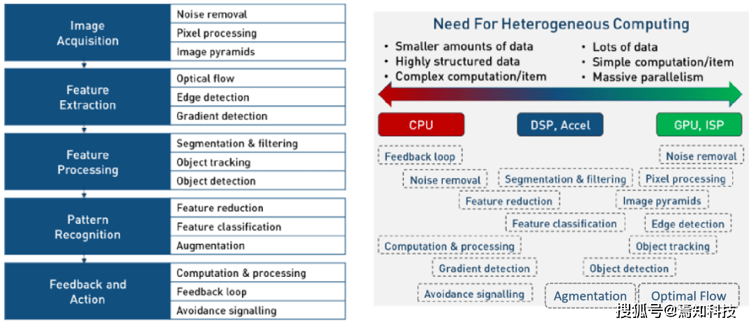 比如自动驾驶中的摄像头视觉图像处理的计算需求为例,它分为图像获取、特征抽取、特征处理、模式识别和动作反馈等步骤。其中对大量图像数据的高速并行实时处理比如像素处理、图像金字塔和梯度检测等需要GPU和ISP图像信号处理器这样专用内核来高速计算。而DSP和专用加速器则偏向卷积或傅里叶等数学计算加速,CPU更倾向通用计算和复杂动作反馈决策。依托异构计算技术能够整合这些不同架构的内核到单一芯片中从而适配自动驾驶的复杂计算要求。