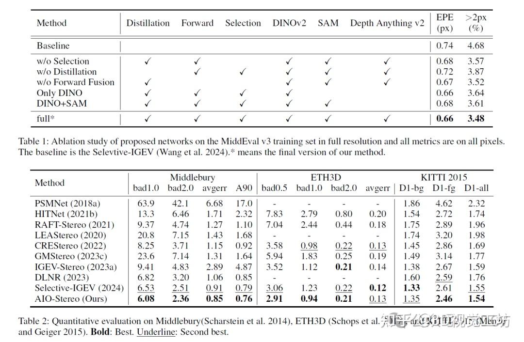 • 实验结果表明,所提出的AIO-Stereo在Middlebury数据集上排名第一,并在ETH3D基准测试中优于已发布的方法。