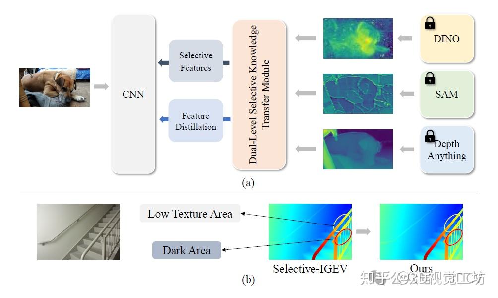 (a) AIO-Stereo的概述,其将来自多个vfm的选定知识转移到单个立体匹配模型。(b)在黑暗和低纹理区域中选择性IGEV和我们的AIO-Stereo之间的比较。