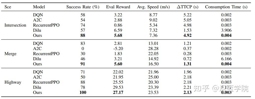 通过表格数据可以看到,在所有场景中,他们的方法都达到了最高的成功率:路口场景88%、汇入场景91%、高速公路场景100%。尽管Dilu在速度和安全边界上优于传统DRL方法,但其延长的推理时间限制了在线部署可能性。