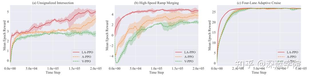 消融研究:为了评估各个组件的影响,研究团队对比了三个版本:原始PPO(V-PPO)、基于注意力的PPO(A-PPO)和基于LLM引导的注意力PPO(LA-PPO)。实验结果显示,LA-PPO相比其他两个版本展现出更快的收敛速度和更高的最终回报,表明了更好的稳定性和鲁棒性。特别是在无信号灯路口和高速公路汇入这样更具挑战性的场景中,LA-PPO能够快速达到更高的回报并在整个训练过程中保持优势。虽然在相对简单的四车道自适应巡航任务中,所有方法最终都收敛到相似的回报水平,但LA-PPO在收敛速度和峰值性能上仍然略胜一筹。这些观察结果证实了将LLM引导与注意力机制相结合能够产生更有效的教师知识转移和更好的策略学习效果。