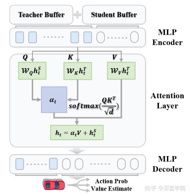 策略蒸馏与融合:虽然教师代理提供了高层指导,但它并不直接提供动作概率或价值估计。为了弥补这一差距,研究者在学生的策略网络中嵌入了基于Transformer的自注意力机制。这个组件以数据驱动的方式近似教师的隐含策略,并将其与学生学习到的策略灵活融合。