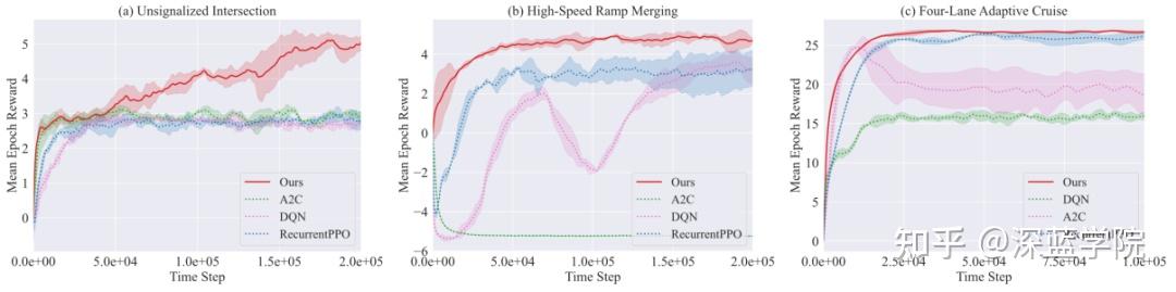 与基线方法的比较:研究团队将他们的方法与四种算法进行了对比:基于价值的DQN、基于策略梯度的A2C、基于序列记忆的RecurrentPPO,以及当前最先进的基于LLM的方法Dilu。在无信号灯路口场景中,他们的模型在初始训练阶段快速改进,并收敛到最高的最终回报。在高速公路汇入场景中,他们的方法在早期就达到高回报,并在约5万步后稳定在接近最优的表现。在四车道场景中,所有方法都显示出快速的早期增益,但在最终回报和稳定性上存在显著差异。
