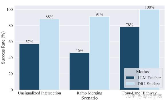 教师-学生比较:研究者进一步检验了LLM教师和DRL学生在各个场景中的成功率。结果显示,学生在所有任务中都超越了教师的表现。这一现象说明,虽然LLM引导有助于早期学习的快速进展,但持续的环境交互使得学生能够改进并最终超越教师的性能。这个发现突出了教师-学生范式在自动驾驶策略学习中的优势。