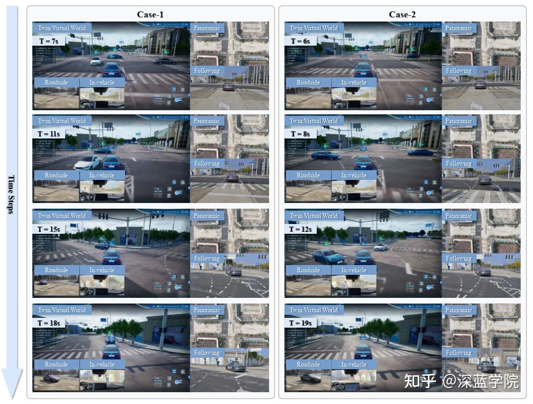 研究团队在虚实融合平台上进行了实车实验,以评估TeLL-Drive框架的性能。分析了两个具有代表性的案例,每个案例都从多个视角进行记录,包括虚拟孪生平台视角、无人机鸟瞰视角、跟车视角、路侧视角和车内视角。这些多角度的观察使得团队能够对算法在不同场景下的表现进行全面分析。