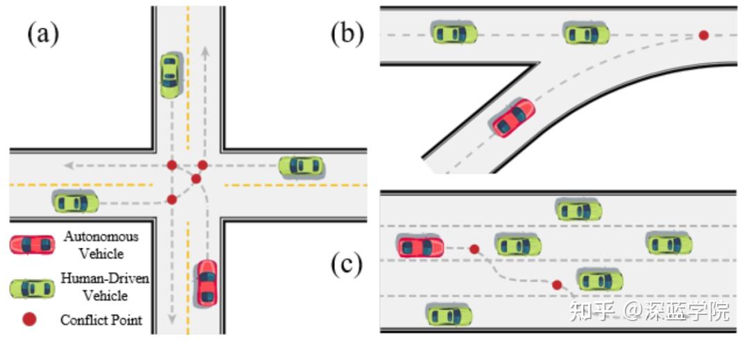 1)无信号灯路口:自车需要在无信号灯路口执行受保护的左转,这要求系统能够解决冲突并选择合适的时间窗口来安全通过交叉路口。