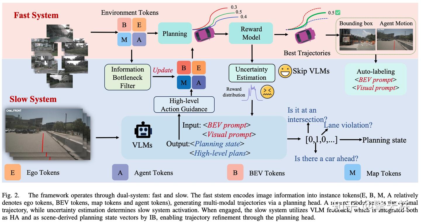 • 提出FAst-Slow fusION(FASIONAD)框架,集成端到端(E2E)快速规划系统与基于视觉语言模型(VLM)的慢速推理系统。通过不确定性估计算法 (Laplace分布建模)动态触发系统切换,在常规场景保持E2E实时性(3.6-7.1 FPS),复杂场景激活VLM深度推理。