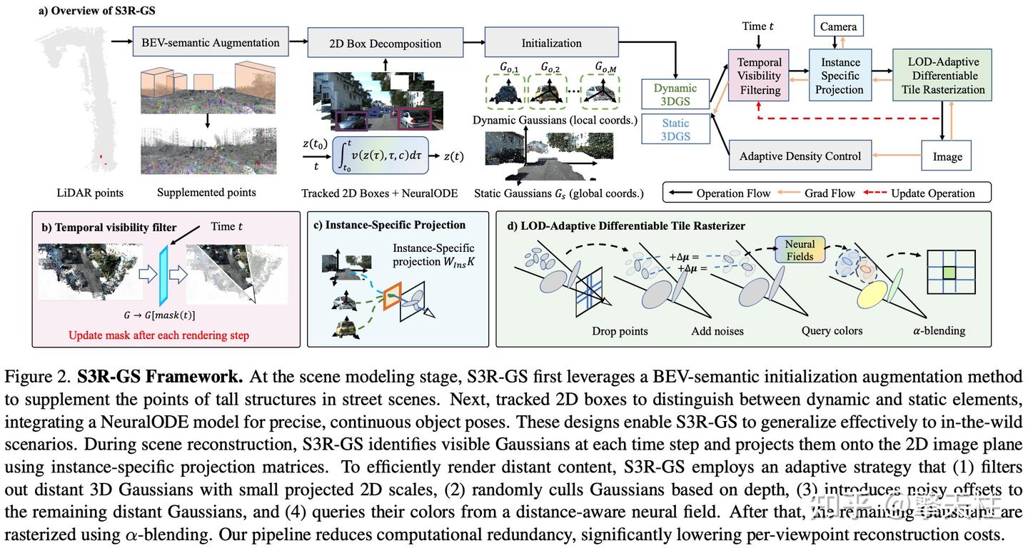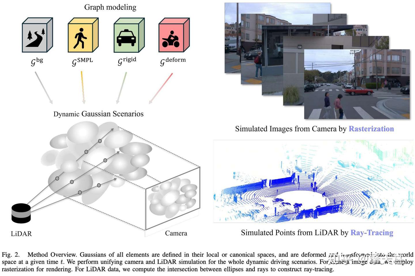 提出动态高斯场景图(Gaussian scene graph),统一建模静态背景与动态实体(如刚性车辆、非刚性行人)。针对相机与LiDAR的传感器特性差异,分别采用栅格化(Rasterization)与高斯射线追踪(Gaussian Ray-Tracing)进行渲染: